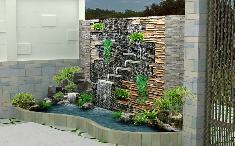 Thiết kế tường nước phải phù hợp với phong cách của không gian. Vật liệu được chọn cần có khả năng chịu nước và thời tiết tốt, đồng thời tạo ra hiệu ứng thị giác đẹp mắt. Những vật liệu thường được sử dụng bao gồm: